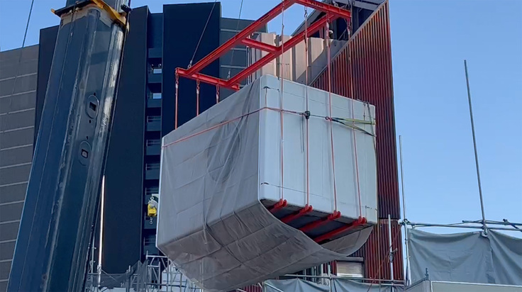 オレンジ色の鉄骨で制作された「天秤」に吊され、クレーンでおろされるカプセルB1108