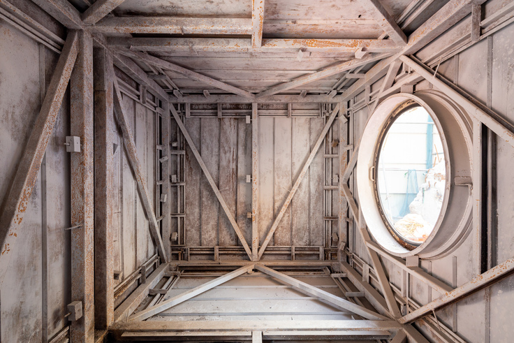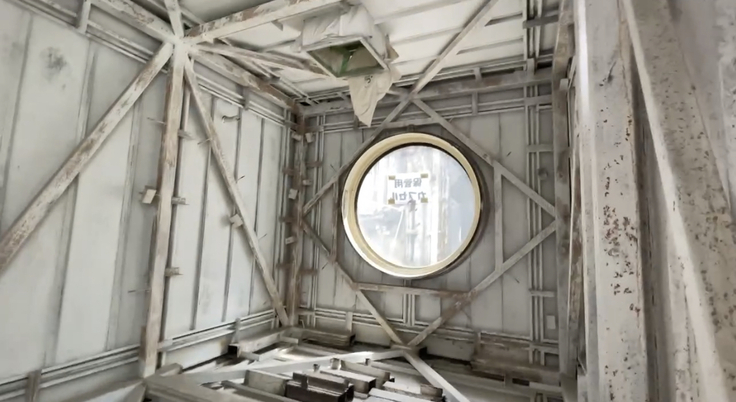 タワーから降ろされた直後のカプセルA606の内部。下部の鉄骨フレームが一部カットされているのは、アスベスト除去のため