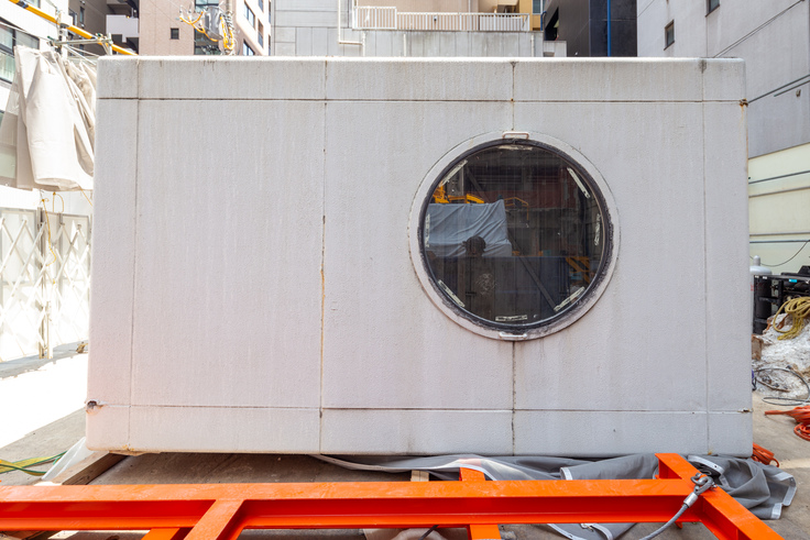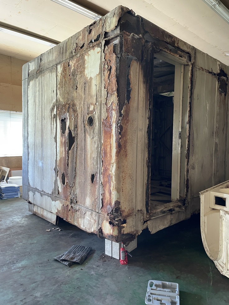 カプセル内にあったアスベスト(石綿)除去のため、内装は全て先に撤去されていました。そのため、タワーから降ろされた全てのカプセルは、スケルトン(鉄骨フレーム、鋼板の外壁、丸窓のみ)の状態でした。