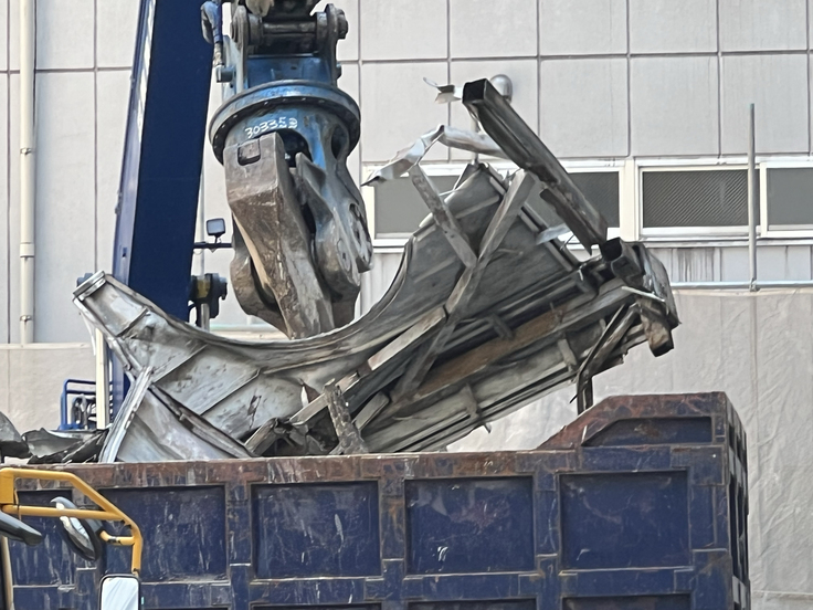 カプセルの丸窓があった外壁を重機でつぶし、廃棄のトラックに載せている様子。写真は、B1108の後に廃棄された別カプセルの様子です