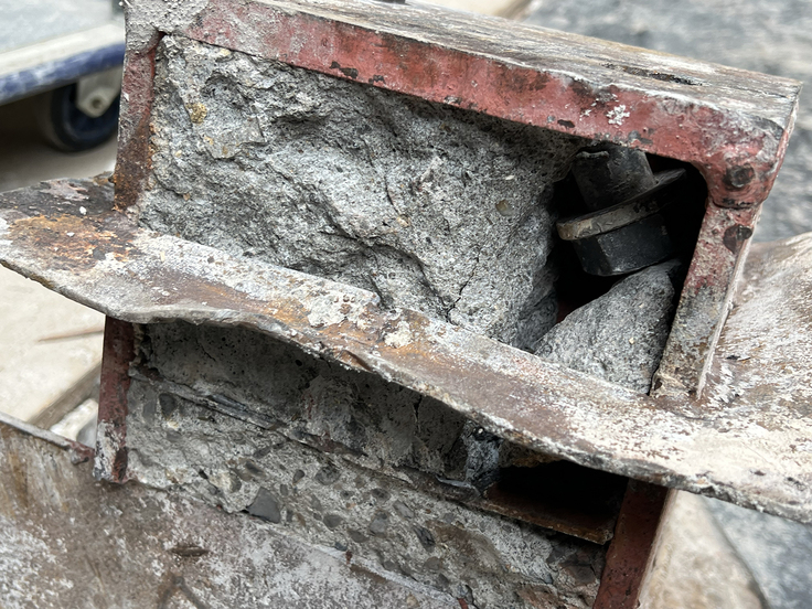 カットした鉄骨フレームの断面と外壁のすきまが分かる写真。手が入らないすきまにアスベストが残っている可能性が高いため、固着液を使用して「封じ込め」の処理がとられた