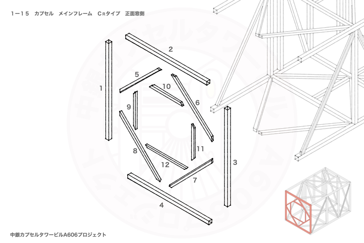 たとえば、下記のパーツリストでも表現しているように、カプセルA606(C_Rタイプ)の丸窓側の左右の柱は土台の上に載り、梁の上端まで伸びています。上端はパイプのままでふさがっていません。