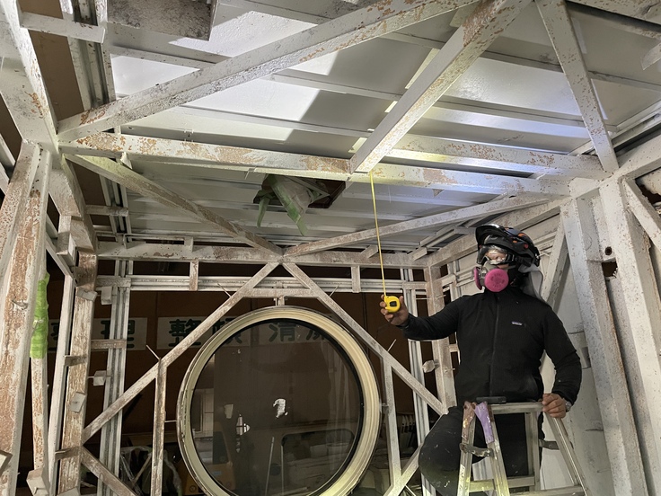 カプセルにはA・B・C・Dのタイプがあり、それぞれを実測すると微妙な違いがあり、カプセルのタイプごとに躯体の鉄骨の断面形状や大きさが違うことも分かってきました。下記の写真は丸窓が長辺の壁にあり、扉が短辺にあるBタイプです。さらに下の写真はカプセルA606でCタイプです。