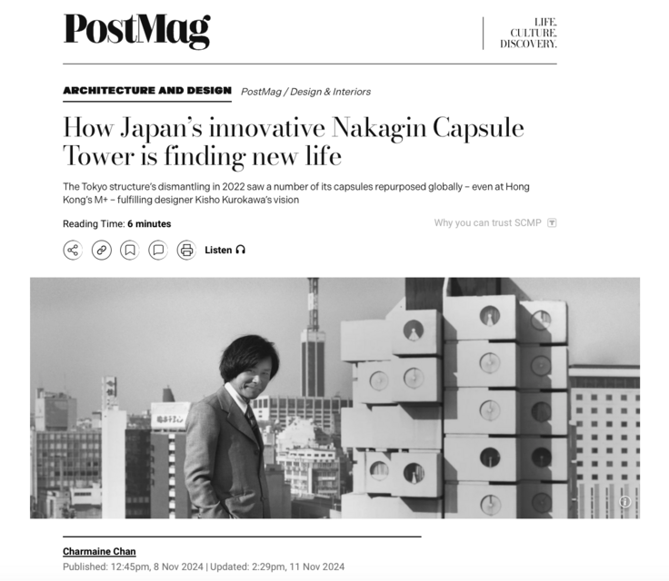 ご報告が遅くなりましたが、香港の美術館M+に中銀カプセルタワービルのカプセルが展示された関係から、2024年11月8日にSouth China Morning Postで記事が掲載されました。How Japan’s innovative Nakagin Capsule Tower is finding new life