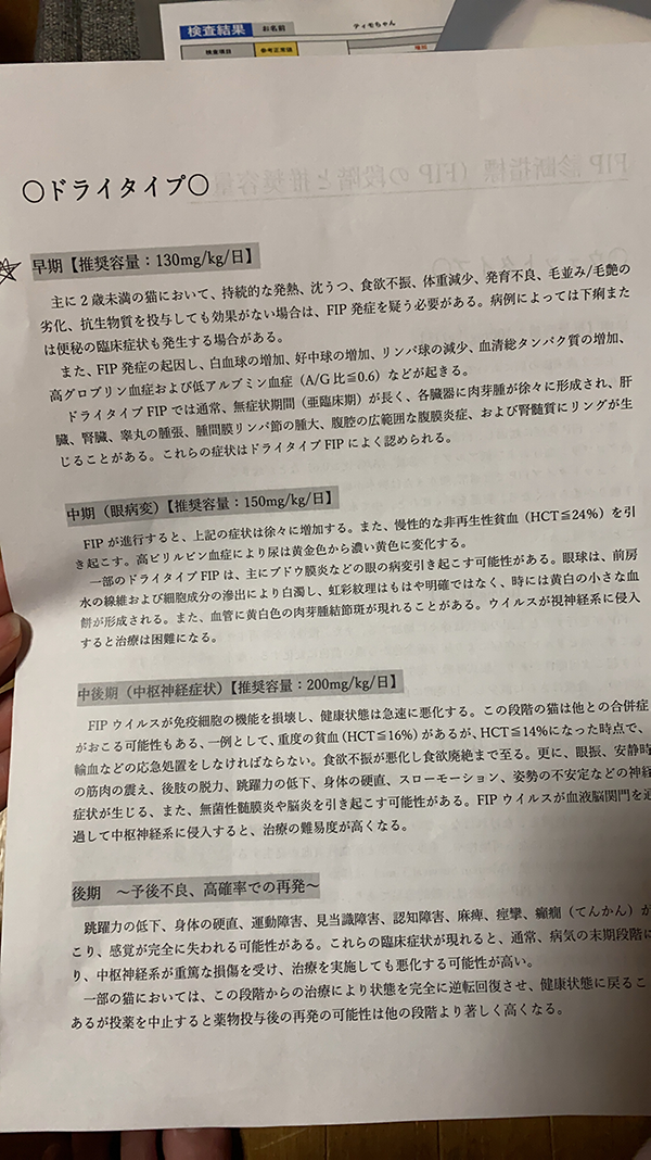 そして保護猫団体さんと相談させて頂き、もしFIPだとしたらティモの体力のあるうちに