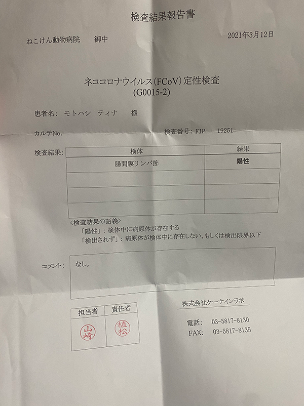 病院から電話があり、PCR検査の結果がきて陽性だったで確定診断させて頂きますという内容でした(報告書には何故かティモがティナになっています。。。)