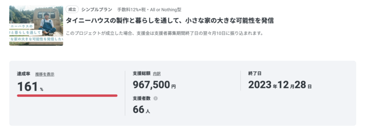 のべ66名の方々のおかげで達成率161%、目標金額の367,500円も上回る計, 967,500円ものご支援をいただきました!!