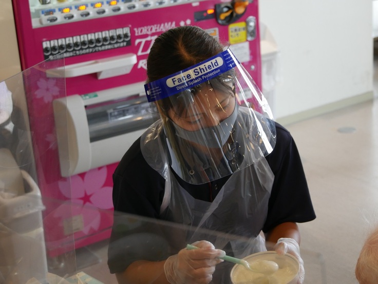 新型コロナウイルス感染拡大を防ぐためにエプロン・手袋・フェイスシールドを着用し入居者様にもしもの事が無いように感染防止対策をしっかり行っています。