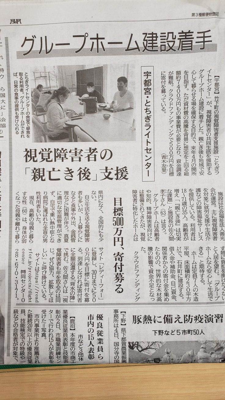 現在実施している視覚障がい者に特化したブル―プホームについて、クラウドファンディングを行っていることも含め、地元の新聞紙である「下野新聞」に11月6日(土)掲載されました!