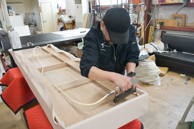 また、家族控え室に設置するソファー製作所への見学の機会をいただき、今回の改修に携わっているチア・アートと当該部署のスタッフで訪問していきました。実際に作っている様子を見学することができて、ソファーの色味やデザイン、サイズ感などを確認することができました。