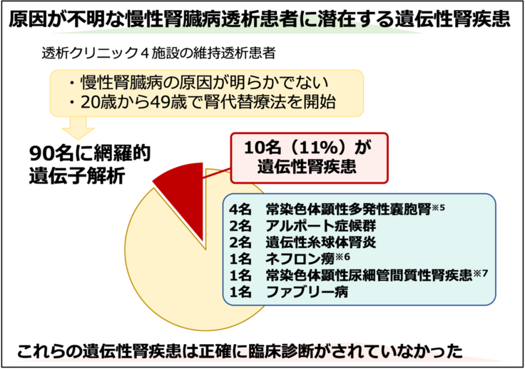 医療法人眞仁会の協力を得て4つの外来維持血液透析施設に通院する1164名の患者さんのうち、20歳から49歳の間に腎代替療法を開始し、慢性腎臓病の原因となる腎疾患が明らかでない患者さん90名を対象に、我々が開発した298個の遺伝性腎疾患の原因遺伝子の網羅的解析を行いました。その結果、10名(11%)に遺伝性腎疾患が遺伝学的に診断されました。さらに、これらの患者は透析導入時に正確な臨床診断はされていませんでした。本研究で診断された遺伝性腎疾患の中にはファブリー病やアルポート症候群など、早期診断および早期治療にて慢性腎臓病の進行を抑えられる疾患も含まれていました。