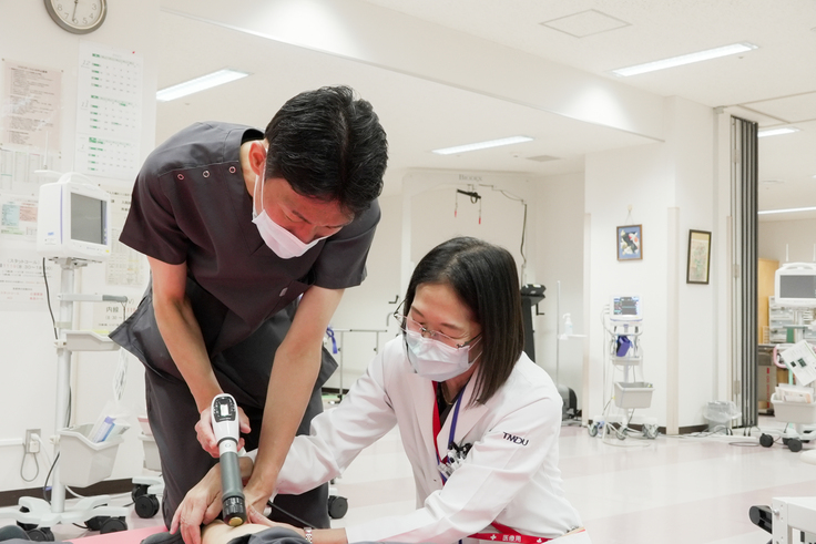 具体的には、かれらのリハビリテーション治療の場面において、強く緊張している筋肉に圧力波を当ててその有効性を調べ、これからのリハビリテーションに活かしていきます。