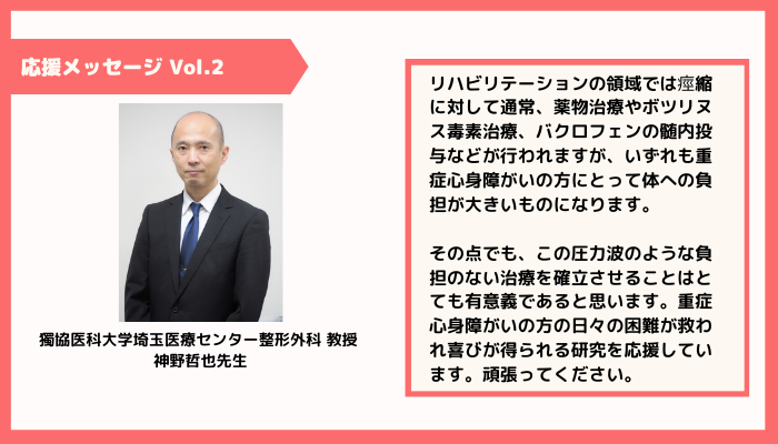 その点でも、この圧力波のような負担のない治療を確立させることはとても有意義であると思います。重症心身障がいの方の日々の困難が救われ喜びが得られる研究を応援しています。頑張ってください。