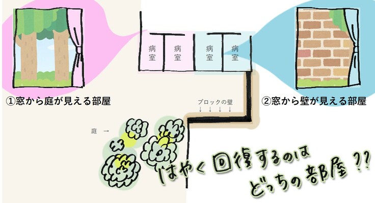 図のように、①庭が見える部屋に滞在した患者さんと、②目の前が壁の部屋に滞在した患者さんに分けました。