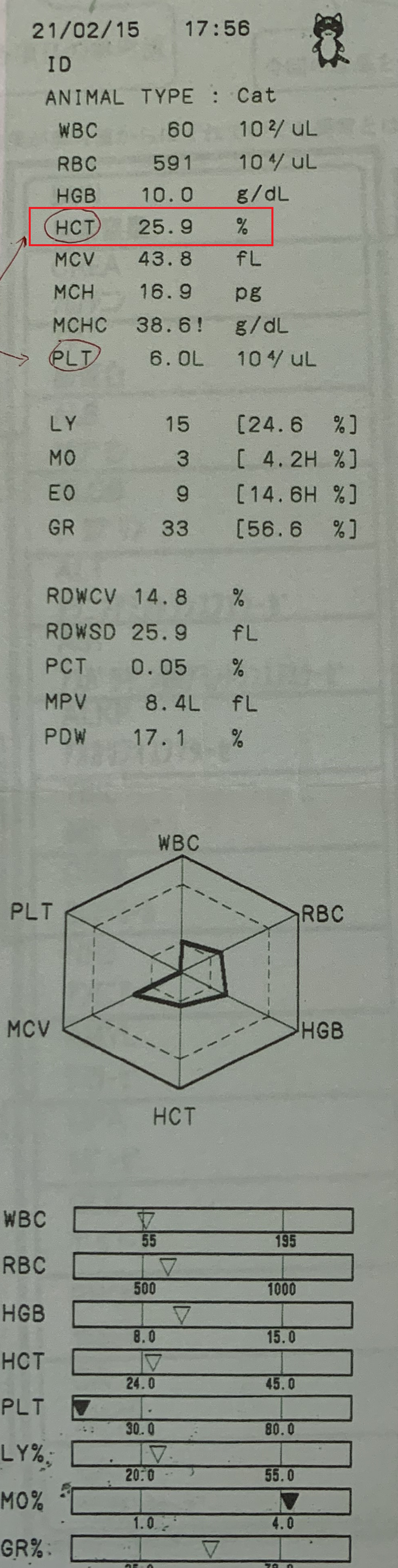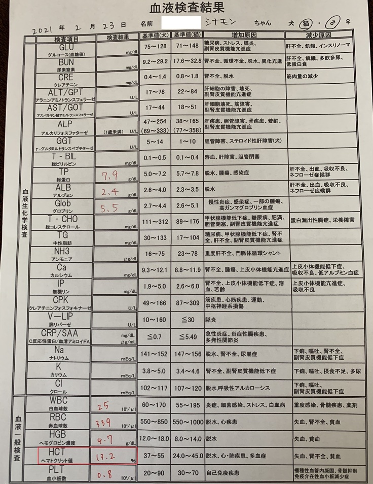 HCTは貧血状態を示す数値となりますが、基準値から大きく外れ、約1週間で25.9%から13.2%まで落ち込んでいることから症状は重症化しており、セカンドオピオンでも残念ながらFIPドライタイプ後期の診断でした。HCTは、10%を下回ると輸血が必要になるレベルとなります。シナモンは貧血状態だったため、動くことが出来ず、鼻の色もピンク色から白色に変わっていました。