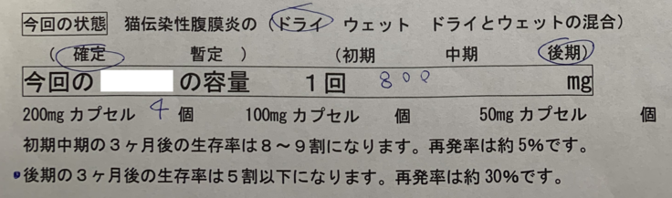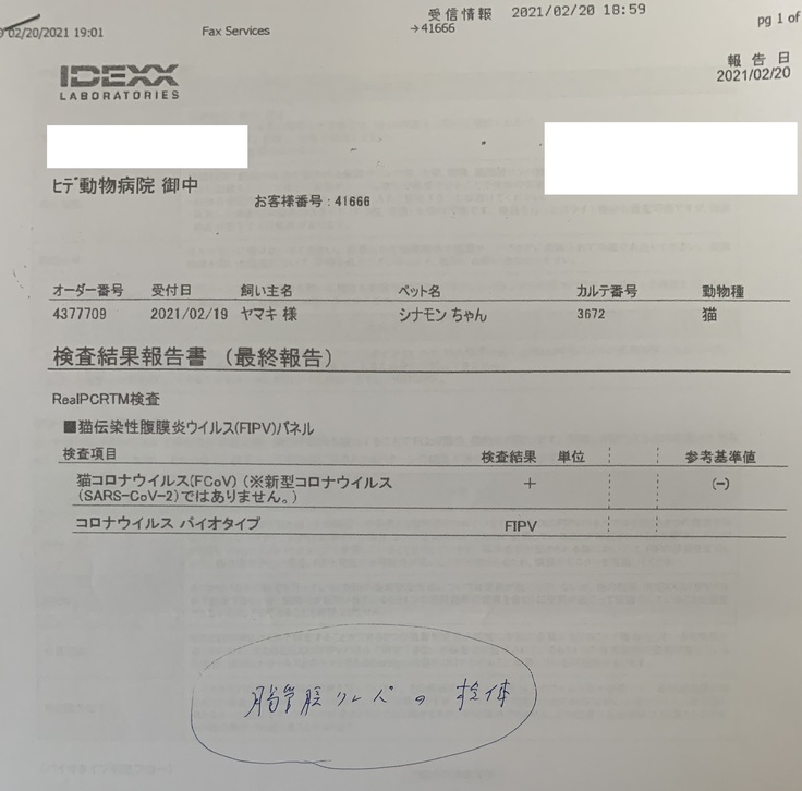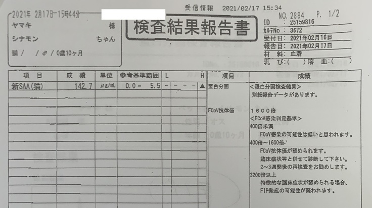 2021年2月21日、精密検査の結果、残念ながらFIPドライタイプと判明しました。