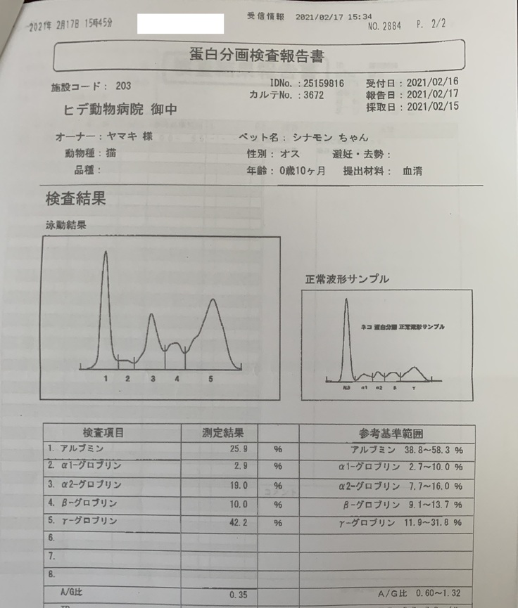FIPと診断された対応経緯を記載いたします。2021年2月15日の血液検査結果は以下となります。