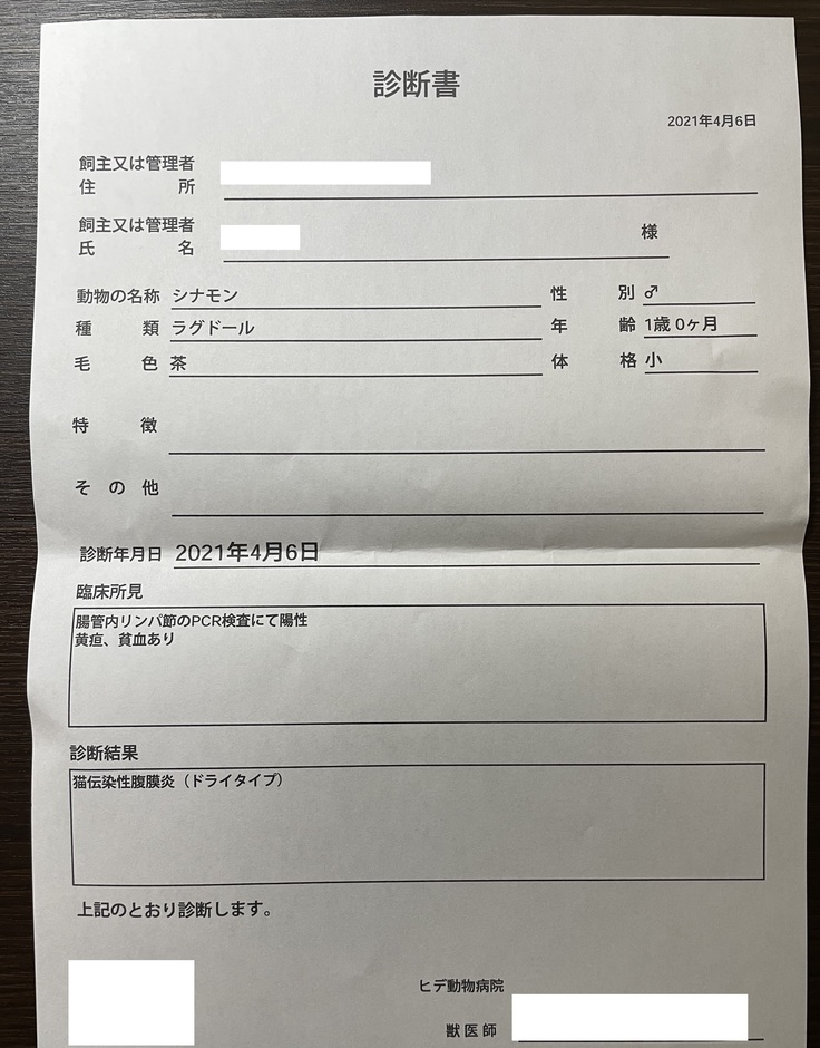 シナモンの症状が少しでも軽くなることを願い、2021年2月23日から未承認薬の投与を開始しました。後日、病院側から入手しました診断書は以下となります。