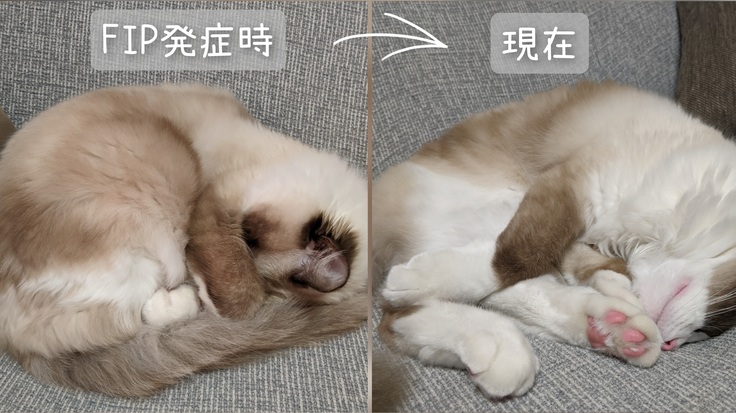 FIP発症時は小さく丸まって、外との世界を遮断するように1日中寝ていました。とても苦しい状態だったと思います。未承認薬を投与して元気になり、食欲が戻るのに合わせて、リラックスして寝るようになりました。気持ち良さそうに寝ているシナモンを見ると、苦しみから解放されていることを実感します。