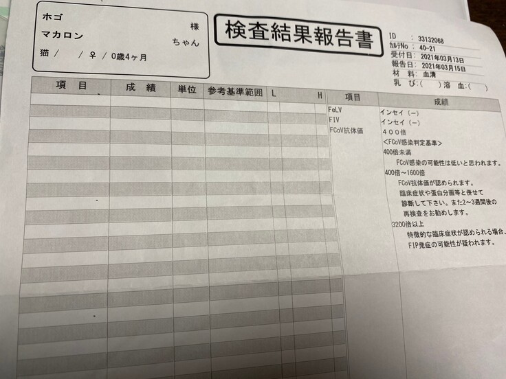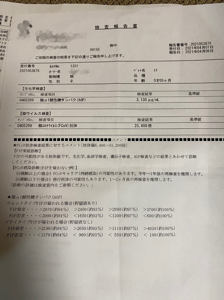 処方された薬を服用させても改善しない中、抱っこした時に泡をふいた為、再受診したところFIP疑いと診断されたそうです。