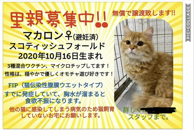 譲渡店舗に移動したときにFIPを発症しシェルターに戻されました。