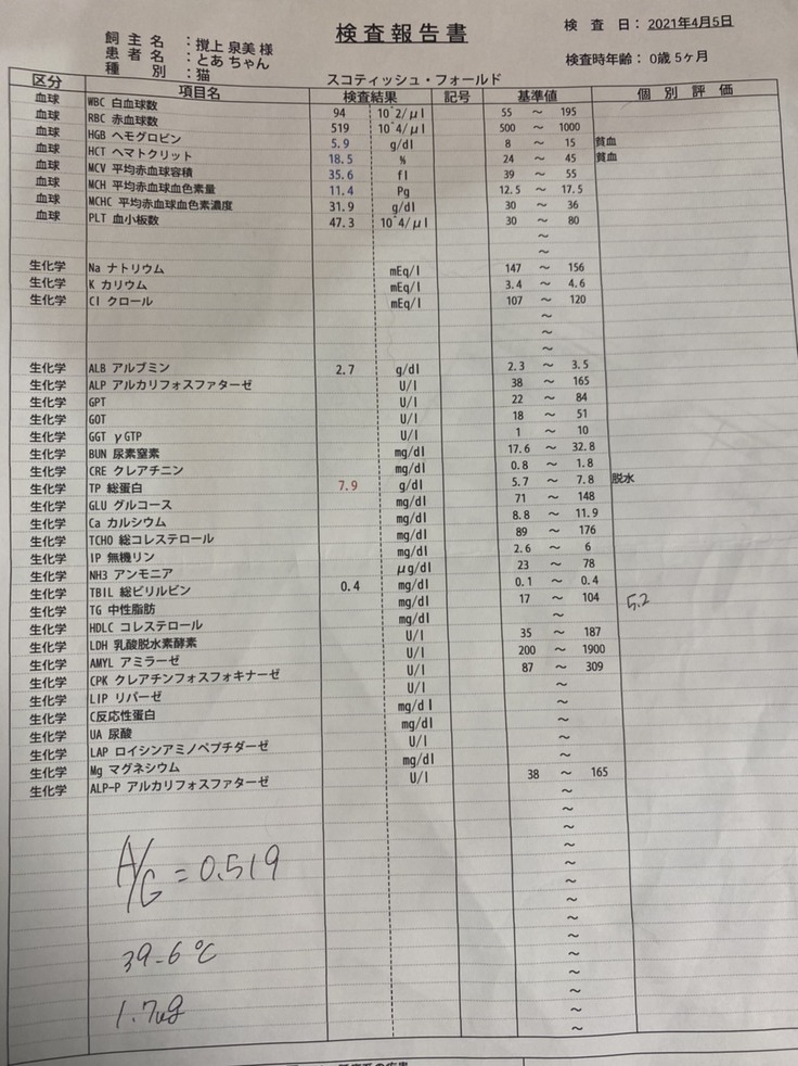 ---------FIP(猫伝染性腹膜炎)疑いと診断---------