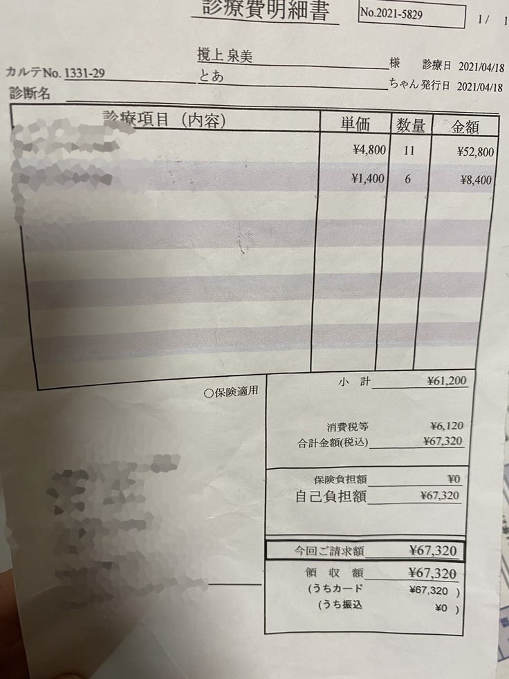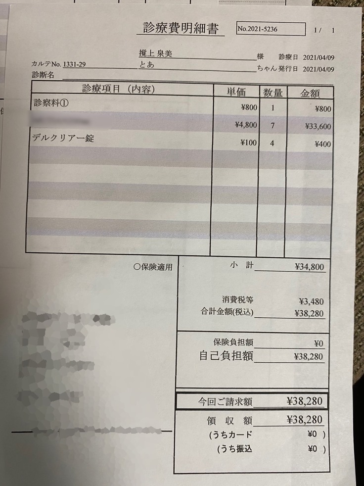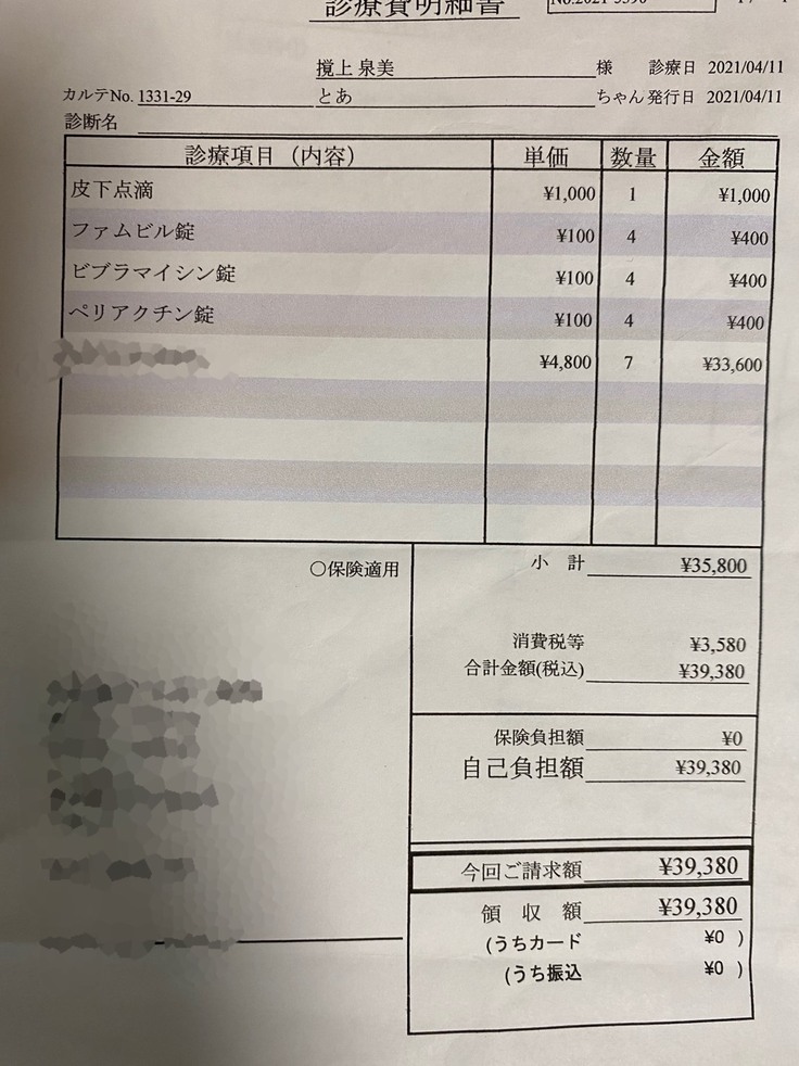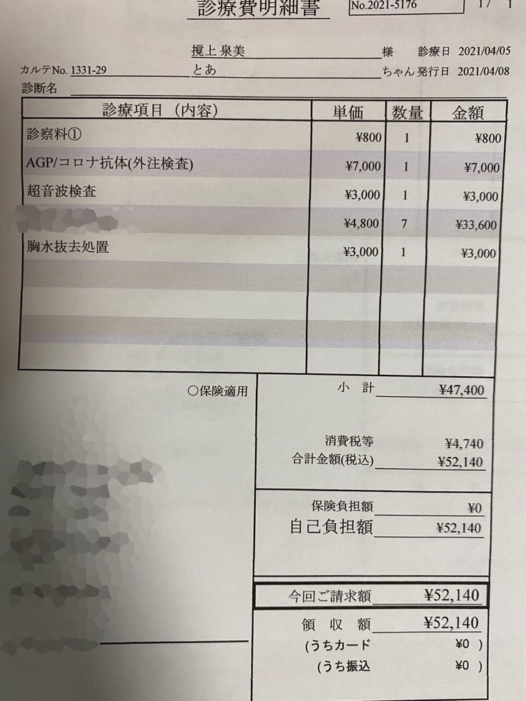 内訳は、体重が予想以上に増えた事により上回った治療費、経過観察中の検査費用、新たに見つかった腎疾患(多発性腎嚢胞疑い)の経過観察の為の検査費用です。