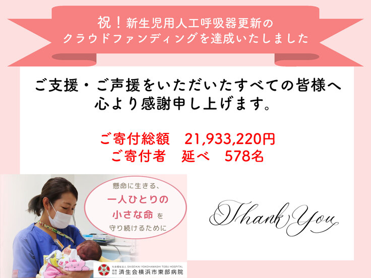 この度の新生児用人工呼吸器更新のクラウドファンディングは皆さまのおかげさまをもちまして、目標金額を超え、達成という形で終了いたしました!