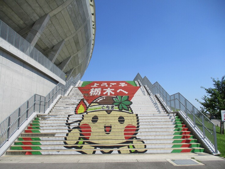 令和4年度「いちご一会とちぎ国体」「いちご一会とちぎ大会」における選手・監督・観覧者等へのおもてなしの一環として、カンセキスタジアムEゲート前大階段に「とちまるくん階段」【ようこそ栃木へ】階段アートを設置。スタジアムのシンボルとして当初は国体・とちぎ大会終了までの約半年間の設置予定でした。