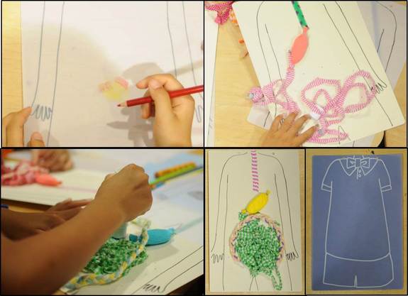 たとえば消化がテーマの回「ぼく、わたしのからだ」~たべもののとるみち~であれば、食べ物が口から入ってうんちになるまでの歌を歌ったり、色彩豊かな布や紙でできた「からだキット」を使って口から肛門までの臓器のみちを作り上げます。
