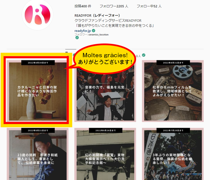 READYFORの公式Instagramで掲載してもらいました!