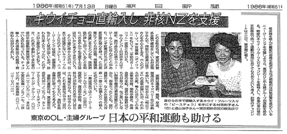 ニュージーランドでは80年代、市民たちがアメリカの核を搭載した原子力潜水艦の寄港を阻止する運動を展開しました。政治的な立場やイデオロギーを越えて、自分たちの住む国の“綺麗な、美しい海を守りたい”、の一点で団結してアメリカに「NO」と言いました。アメリカはその後、報復措置としてNZに対して経済制裁を加えました。その時にNZの友人が日本も何かできることで、この政策をサポートして欲しいと言って来ました。これを受けて、友人たちと相談して、NZ産のキウィーフルーツが入ったチョコレートを輸入して日本の平和運動グループに売り、それを彼らの活動資金とする、という趣旨で活動を始めました。そのために友人5人で “Peace Choco Working Group”という小さなグループを立ち上げました。