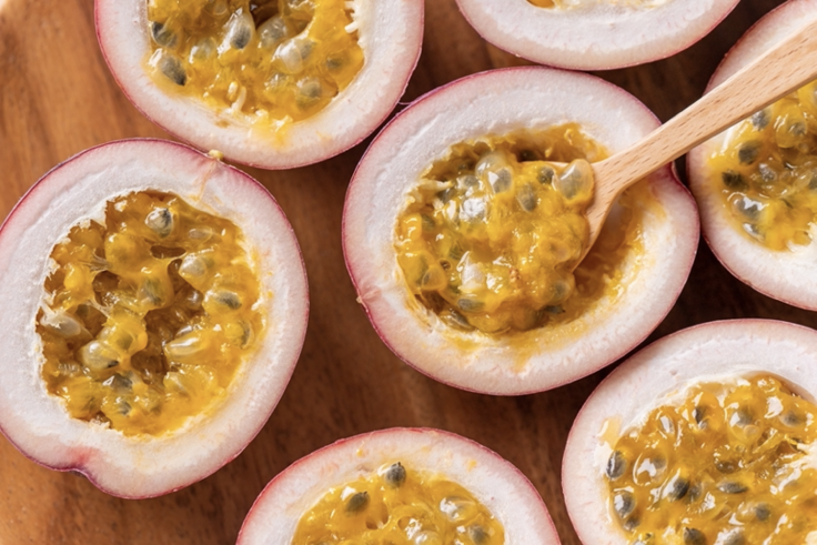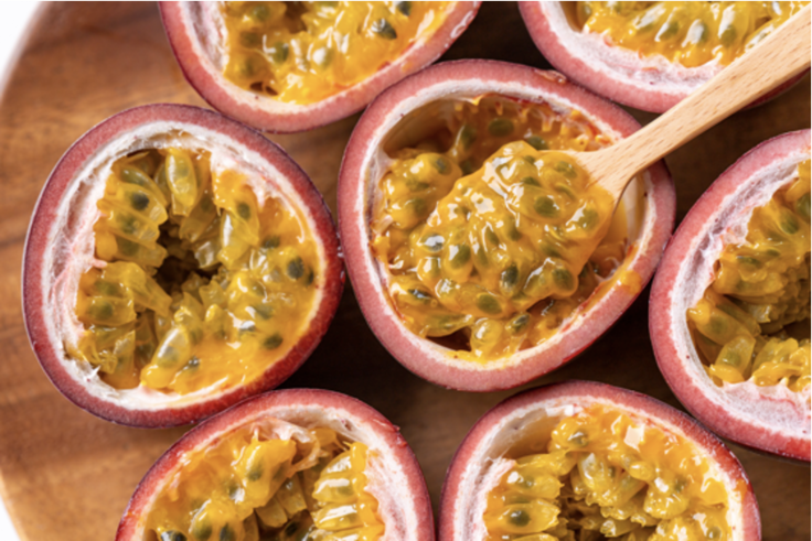 パッションフルーツには、β-カロテン、葉酸、ビタミンC、クエン酸、カリウムなどが含まれており、美容効果が高いことに加え、疲労回復、高血圧や動脈硬化などの生活習慣病予防の効果があると言われています。
