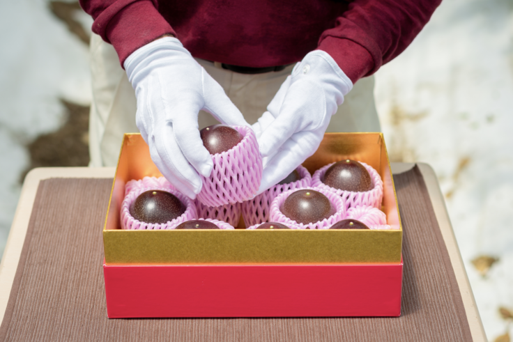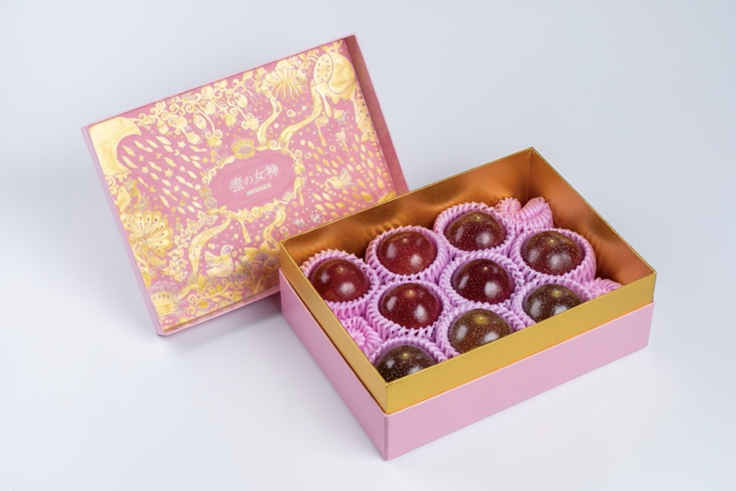 パッケージ製作のポイントは、①県外に発送しても潰れない丈夫なパッケージであること、②傷や色むらの無い秀級果実にふさわしい継ぎ目のない美しい箱であること、③「元気を与える果実(情熱の女神)」「至福を与える果実(蜜の女神)」という各ブランドの理念を受け取った瞬間に感じてもらえること。
