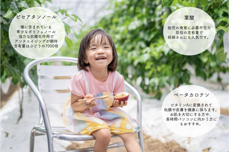 種をバリバリ食べられる珍しい果実ですが、種の中にはピセアタンノールと呼ばれる強力な抗酸化作用を持つポリフェノールが、ぶどうの7000倍も含まれてます。細胞を酸化から守り、アンチエイジング効果が期待されています。