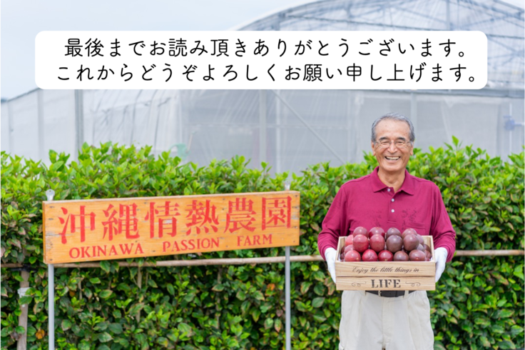 パッションフルーツを「手にした瞬間から食後まで、感動をもたらしてくれる果実」にするために、そして沖縄のパッションフルーツ業界の未来を変えるために、皆さんのお力添えの程どうぞよろしくお願いいたします。