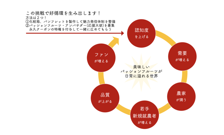 私たちは、このプロジェクトを通してパッションフルーツの認知度を上げることで、農家全体が潤う世界を創りたいと思っています。認知度が上がり、需要が増えて、収益が上がる農作物にすることで、若手新規就農者も増え、全体の品質向上にも繋がり、更にファンが増えるという好循環を作りたい。その先に、日常にパッションフルーツが溢れる世界を創りたいと、私たちは思っています。