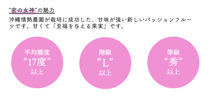 そして今年は、沖縄情熱農園が世界で初めて栽培に成功した「蜜の女神」の品種登録出願を機に、化粧箱とパンフレットを製作して、感動のパッションフルーツを、全国の皆様に届けたい思っています。