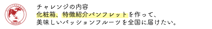 そう思ってもらうため、美味しい果実に育てるのはもちろんのこと、沖縄パッションフルーツの魅力を最大限に伝えるツールとして、化粧箱、紹介パンフレットを製作します。(今回の挑戦費用は化粧箱に使います。)