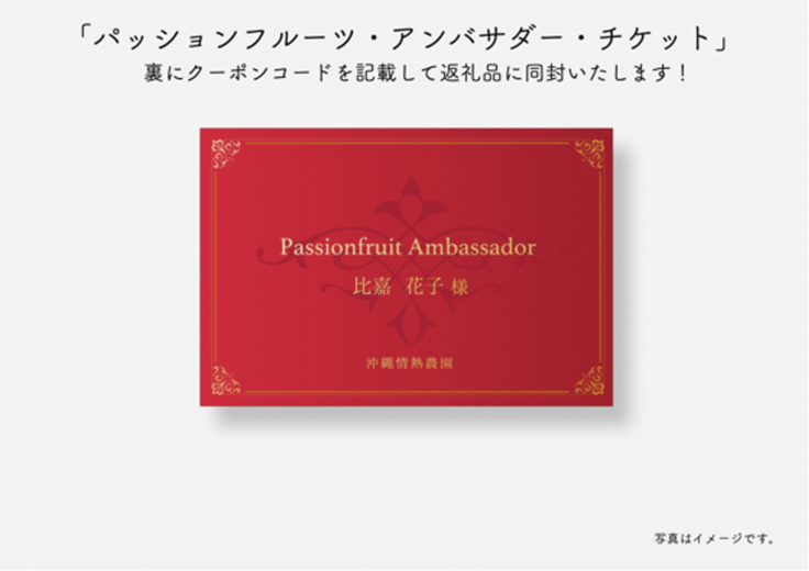 今回ご支援下さった方には、来年度のご予約分を25%割引でご購入いただける「パッションフルーツ・アンバサダー・チケット」を箱に同封いたします。カード裏に記載されたクーポンコードは、沖縄情熱農園ホームページにて何度でもご使用いただけます。一味違ったオシャレな贈り物として、パッションフルーツをご活用頂ければと思います。