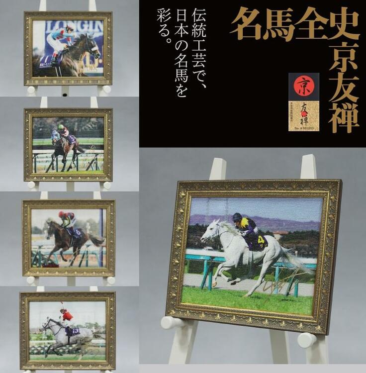 名馬全史京友禅は、京都の高度な技術を持った職人たちの手を経て、丁寧に制作されています。制作工程ごとに専門の職人がおり、分業で仕上げていく京友禅の伝統にのっとった製法で作られているため、細部までこだわり抜いた逸品です。競走馬の魅力のひとつである美しい筋肉の動きや毛並みを再現するために、実際に生地の上で幾度も緻密な色調整を行っています。より実物と近い色合いで、そして勝利を勝ち取る瞬間の勇姿をダイナミックな色彩で染め上げました。 また、週刊Gallop秘蔵の写真をベースに職人が染め上げましたので裏面にはGallopのロゴシールも京友禅の証紙と共に貼ってあります。