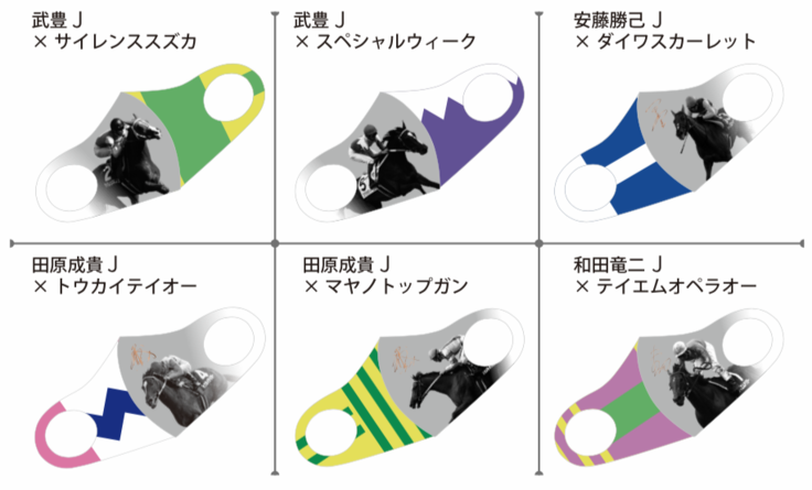 名馬デザインマスクシリーズの第三弾です。トウカイテイオーとマヤノトップガンは田原成貴騎手、ダイワスカーレットは安藤勝己騎手、 テイエムオペラオーは和田竜二騎手の箔押しプリントサイン入り他にもサイレンススズカやスペシャルウィークといった伝説の名馬も参戦!