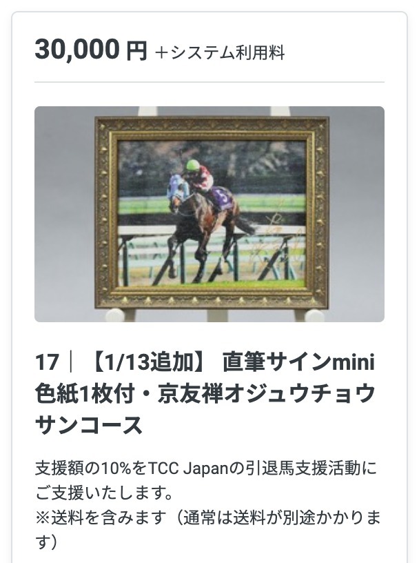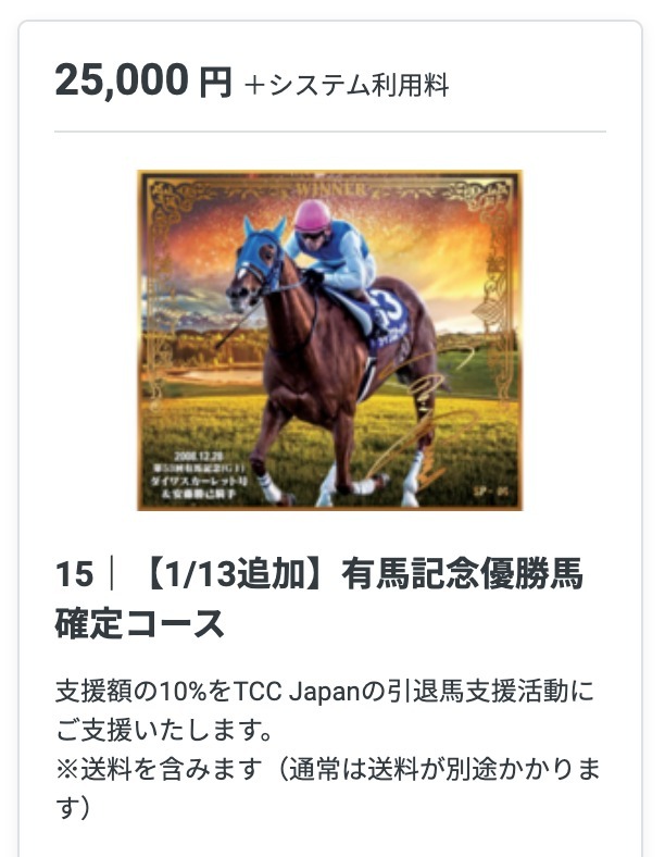 支援額の10%をTCC Japanの引退馬支援活動にご支援いたします。
