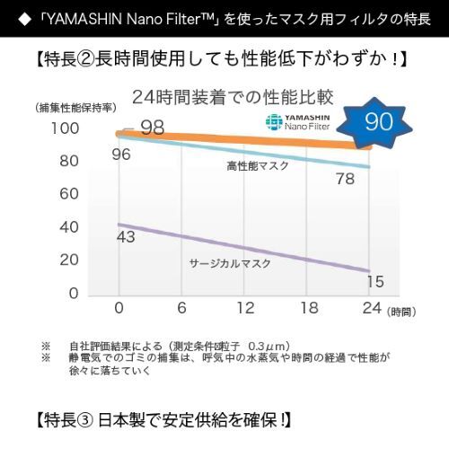 | ※医療用レベルとは、厚生労働省が定める「新柄インフルエンザ等における医療体制においての医療資機材の整備について」においてマスクの規格参考例として示された、 米国労働安全衛生研究所(NIOSH)の定めるN95規格を満たすレベルであり、当マスクはN95相当のフィルタ性能を有します。 |