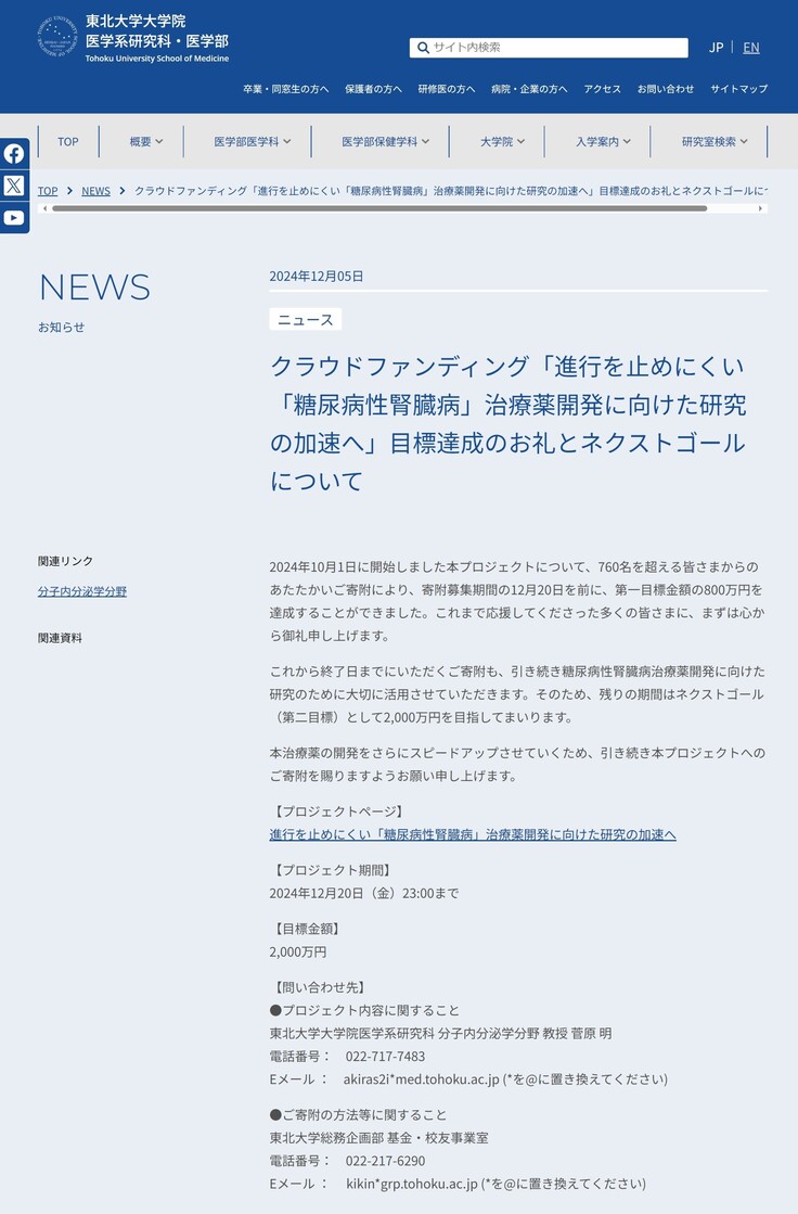 本プロジェクトが東北大学大学院医学系研究科・医学部のホームページに掲載されました。