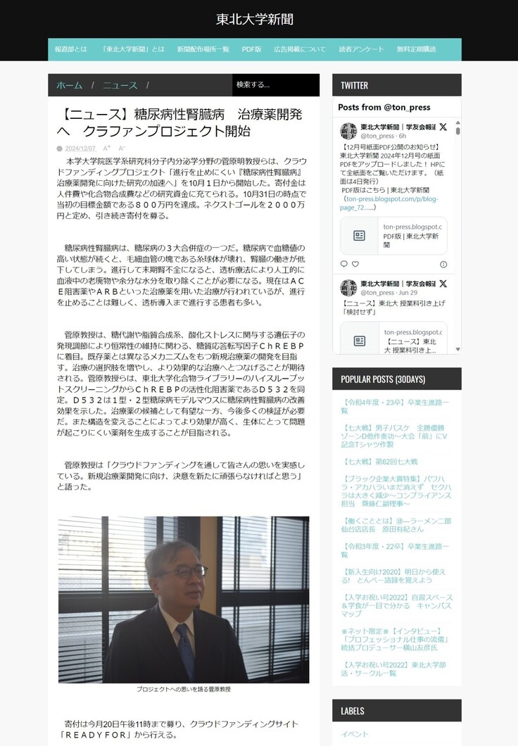 本プロジェクトが東北大学新聞に掲載されました/残りの期間が12日になりました。