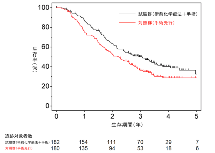 2019年、東北大学総合外科の海野倫明教授が主導した臨床試験により、手術をする患者さんに対する手術前の化学療法によって、手術後の生存期間を延長できることが明らかになりました。