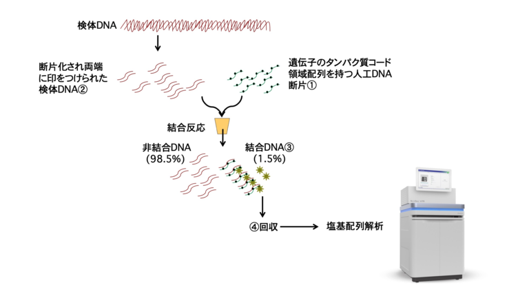 ④ この人工DNAに結合した検体DNAを回収、精製して、高性能の塩基配列解読装置で塩基配列を読み取ります。読み取った塩基配列情報をスーパーコンピューターで解析することにより、検体DNAの配列が基準となる塩基配列とどのように異なっているか、すなわち、どのような遺伝子変異を持つかが判明します。