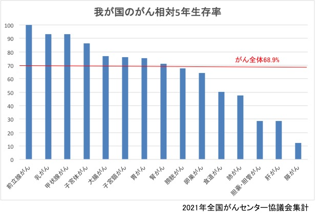 ご承知のように我が国の死因のトップはがんで、国民の1/3はがんで死亡しています。最近、がんの治療法はかなり進歩しており、2021年に発表されたがん全体の5年生存率は68.9%です。*4