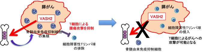 また、膵がん組織ではTリンパ球が排除されているため、オプジーボなどの免疫チェックポイント阻害剤は効きにくいのですが、VASH2を阻害することでTリンパ球排除を解除することができ、免疫チェックポイント阻害剤との併用効果が期待できることも明らかにしました。*3